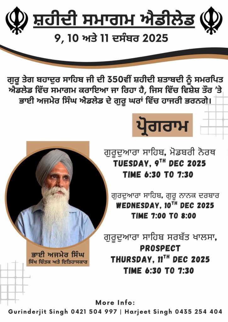 ਸਿੱਖ ਚਿੰਤਕ ਸਰਦਾਰ ਅਜਮੇਰ ਸਿੰਘ ਸਾਊਥ ਆਸਟਰੇਲੀਆ ਸੂਬੇ ਦੇ ਤਿੰਨ ਗੁਰੂਘਰਾਂ ‘ਚ ਗੁਰੂ ਤੇਗ ਬਹਾਦਰ ਸਾਹਿਬ ਦੀ ਸ਼ਹਾਦਤ ਦੇ ਸਬੰਧ ‘ਚ ਰੱਖੇ ਗਏ ਸਮਾਗਮਾਂ ਨੂੰ ਸੰਬੋਧਨ ਕਰਨਗੇ|