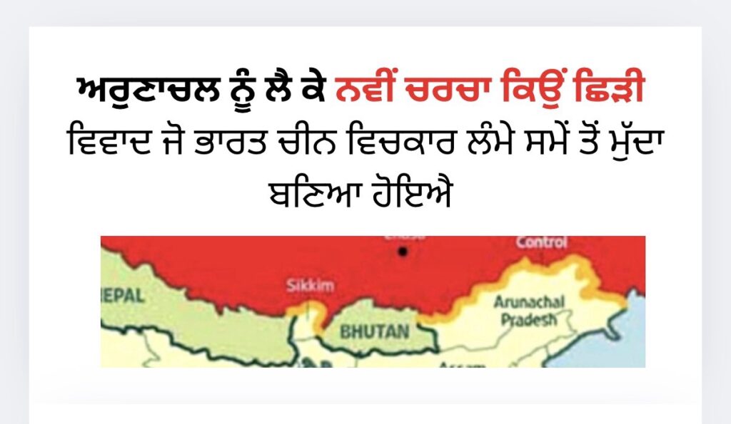 ਅਰੁਣਾਚਲ ਪ੍ਰਦੇਸ਼, ਭਾਰਤ ਦੇ ਉੱਤਰੀ–ਪੂਰਬ ਵਿੱਚ ਸਥਿਤ ਇੱਕ ਸੁੰਦਰ ਅਤੇ ਰਣਨੀਤਿਕ ਦ੍ਰਿਸ਼ਟੀ ਨਾਲ ਮਹੱਤਵਪੂਰਨ ਰਾਜ ਹੈ, ਪਰ ਇਸਦੀ ਮਹੱਤਤਾ ਸਿਰਫ਼ ਇਸ ਦੀਆਂ ਪ੍ਰਾਕ੍ਰਿਤਕ ਖੂਬਸੂਰਤੀਆਂ ਤੱਕ ਸੀਮਿਤ ਨਹੀਂ। ਇਹ ਖੇਤਰ ਦਹਾਕਿਆਂ ਤੋਂ ਭਾਰਤ ਅਤੇ ਚੀਨ ਦੇ ਵਿਚਕਾਰ ਚੱਲ ਰਹੇ ਇੱਕ ਸੰਵੇਦਨਸ਼ੀਲ ਅਤੇ ਸੰਗੀਨ ਸਰਹੱਦੀ ਵਿਵਾਦ ਦਾ ਕੇਂਦਰ ਹੈ। ਦੋਵੇਂ ਦੇਸ਼ ਇਸ ਖੇਤਰ ‘ਤੇ ਆਪਣਾ-ਆਪਣਾ ਦਾਅਵਾ ਰੱਖਦੇ ਹਨ, ਅਤੇ ਇਹ ਮਸਲਾ ਕਈ ਵਾਰ ਕੂਟਨੀਤਿਕ ਤਣਾਅ, ਸੈਨਿਕ ਅੜੱਬਿਆਂ ਅਤੇ ਅੰਤਰਰਾਸ਼ਟਰੀ ਚਰਚਾ ਦਾ ਕਾਰਨ ਬਣਿਆ ਹੈ।