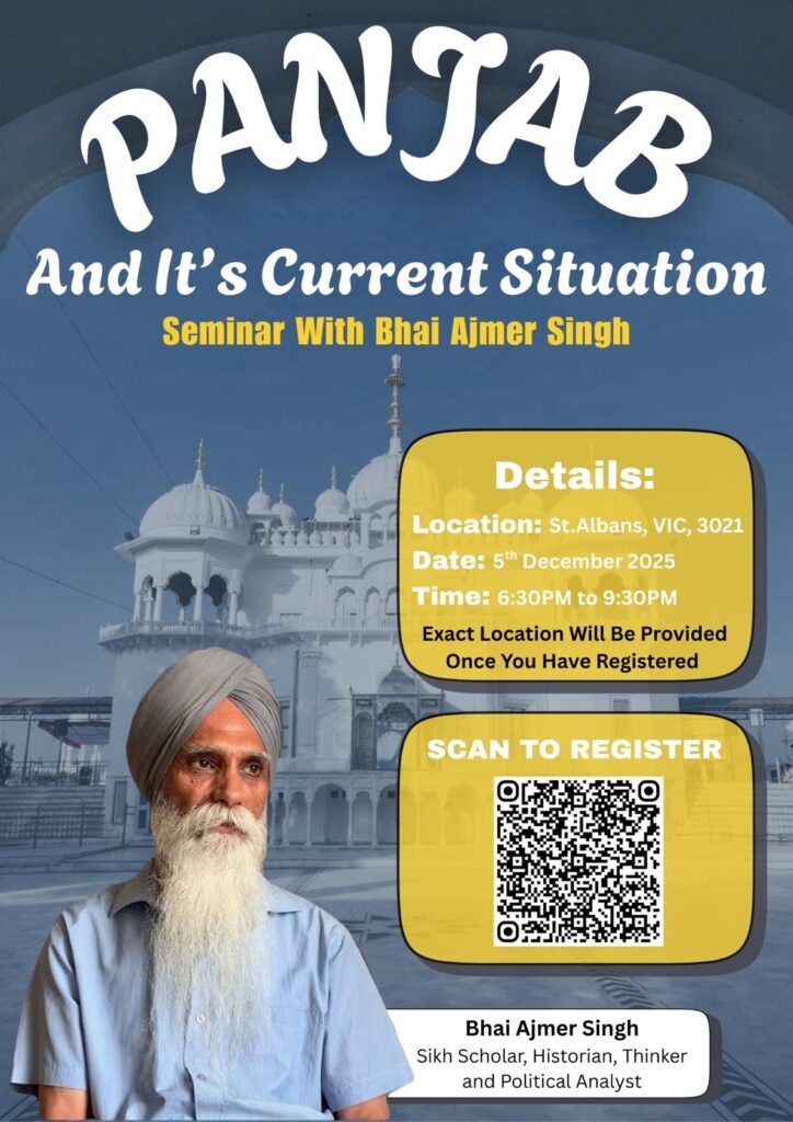 ਪੱਛਮੀ ਮੈਲਬਰਨ ‘ਚ 5 ਦਸੰਬਰ ਨੂੰ ਸ਼ਾਮੀ 6:30 ਤੋਂ 9:30 ਵਜੇ ਤੱਕ ਹੋਣ ਵਾਲੇ ਇਸ ਸੈਮੀਨਾਰ ਦਾ ਮੁੱਖ ਵਿਸ਼ਾ ‘ਪੰਜਾਬ’ ਹੈ। ਇਸ ਬਾਬਤ ਦਾਖਲੇ ਲਈ ਮੁੱਢਲੀ ਜਾਣਕਾਰੀ ਸਾਂਝੀ ਕਰਕੇ ਇਸ ਸੈਮੀਨਾਰ ‘ਚ ਸ਼ਾਮਲ ਹੋਇਆ ਜਾ ਸਕਦਾ ਹੈ।